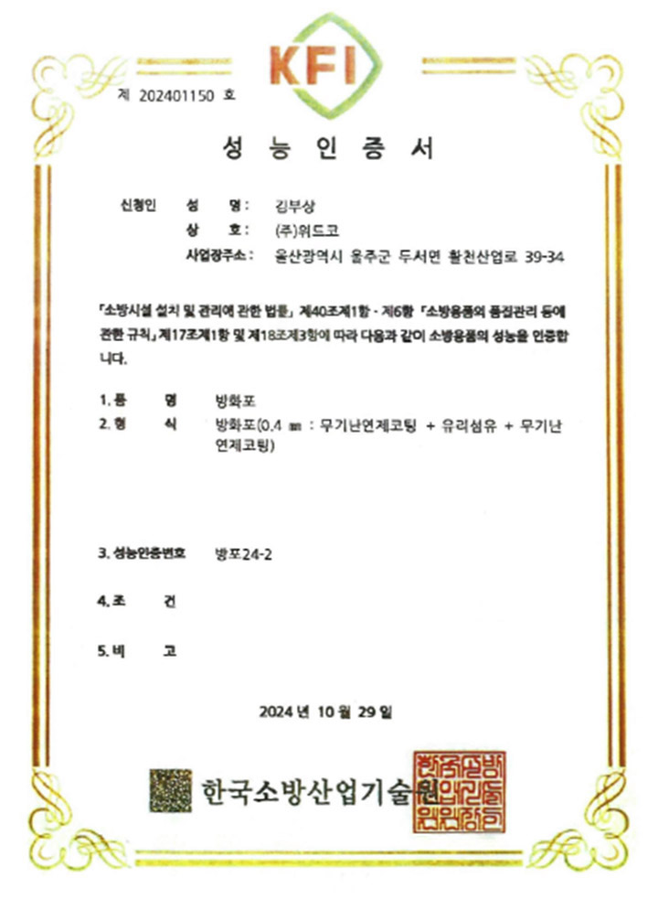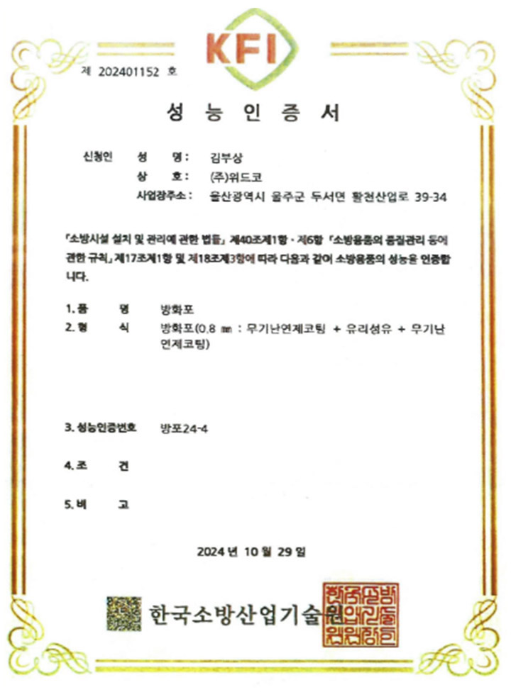 KFI 용접 방화포 제품 규격 및 주 사용처